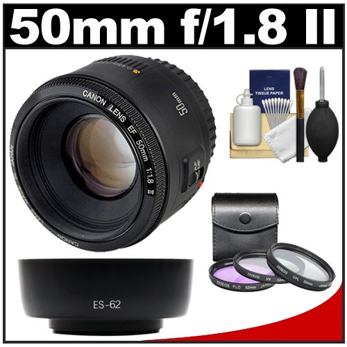 KIT INCLUDES four PRODUCTS -- All BRAND NEW Items with all Manufacturer-supplied Accessories + Full USA Warranties:.<4> PD 6pc Complete Cleaning Kit.<1> Canon EF 50mm f/1.8 II Lens +.<3> ES-62 Lens Hood +.<2> 52mm 3pc (UV/FLD/CPL) Filter +...Canon EF 50mm f/1.8 II Lens with 3 UV/FLD/CPL Filters + Hood + Cleaning Kit for EOS 60D, 7D, 5D Mark II III, Rebel T3, T3i, T4i Features.