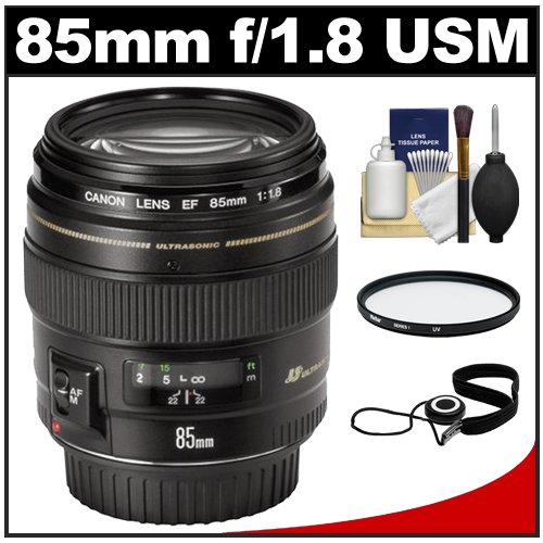 Canon EF 85mm f/1.8 USM Lens PLUS + KIT INCLUDES four PRODUCTS -- All Brand New Items with all Manufacturer-supplied Accessories + Full USA Warranties: Vivitar 58mm UV Glass Filter + CapKeeper 2 Lens Cap Strap + Precision Design Deluxe 6-Piece Lens & Digital SLR Camera Cleaning Kit
